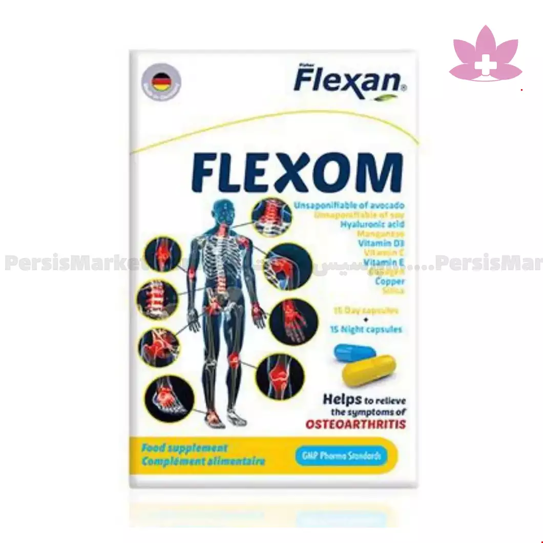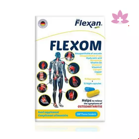 کپسول فلکسوم فلکسان حاوی عصاره آووکادو و سویا، هیالورونیک اسید و برخی از ویتامین ها و مواد معدنی مفید جهت سلامت غضروف ها و مفاصل می باشد که موجب پیشگیری و درمان علائم ناشی از بیماری های التهابی بر مفاصل همچون آرتریت می شود.