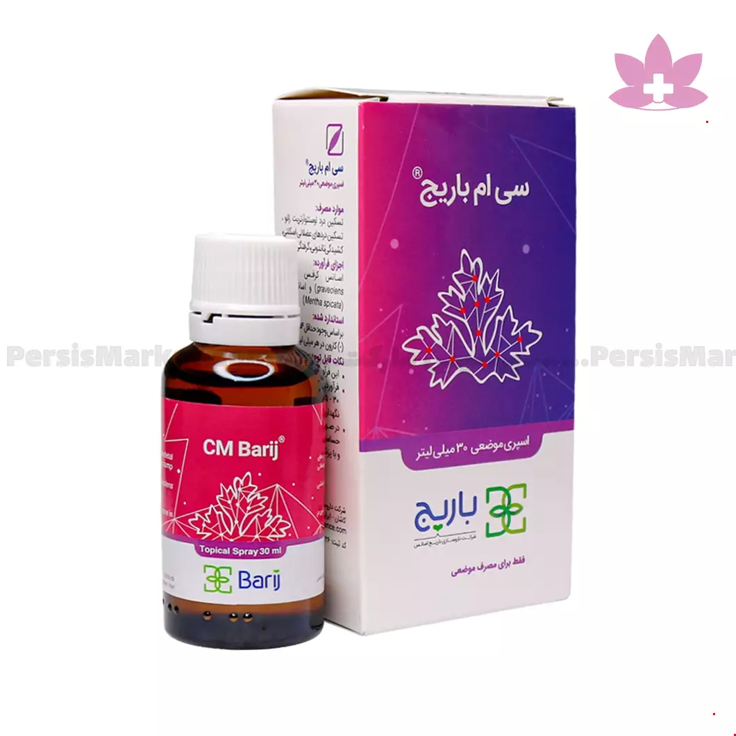 اسپری موضعی سی ام باریج حاوی اسانس کرفس و نعنا بوده که جهت تسکین دردهای عضلانی اسکلتی و رفع گرفتگی های عضلانی مورد مصرف قرار می گیرد.